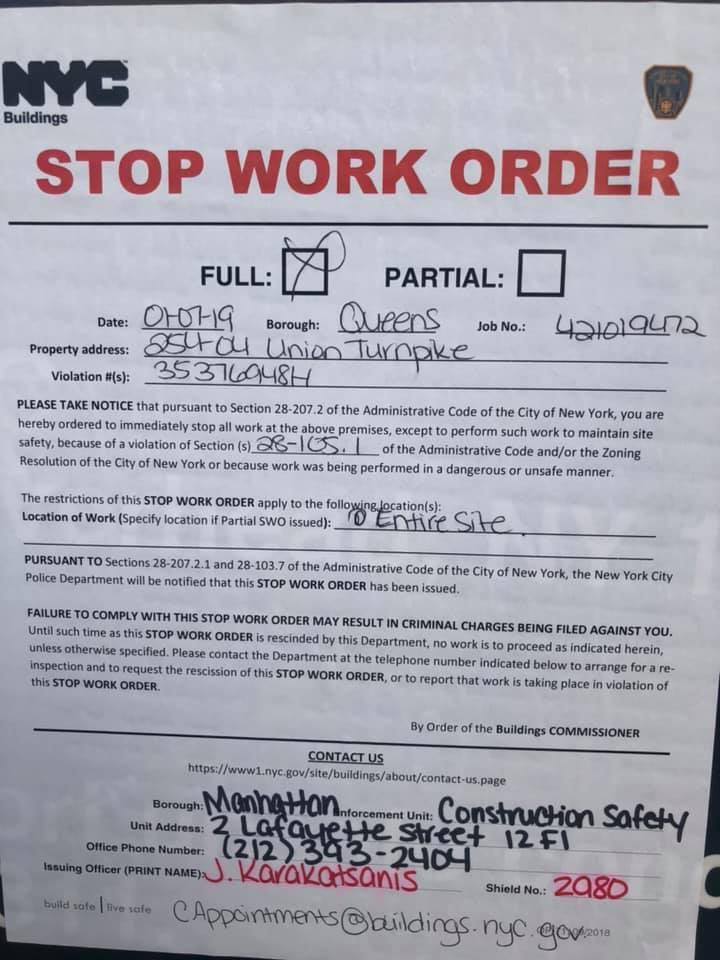 The new location of SNAP at 254-04 Union Turnpike in Glen Oaks has received another stop work order for the entire site due to lack of safety.
