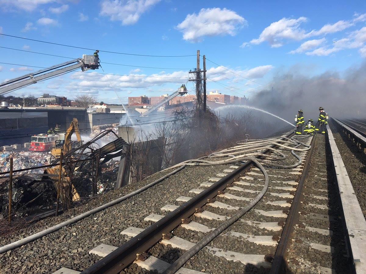 FDNY reported on firefighter suffered minor injury and there were no other injuries in Jamaica at the Royal Waste Services company. Also reported the fire is not fully contained and firefighters will continue until Saturday. LIRR resumed with limited service for eastbound but westbound remains shut down. More than 200 firefighters are on the scene.