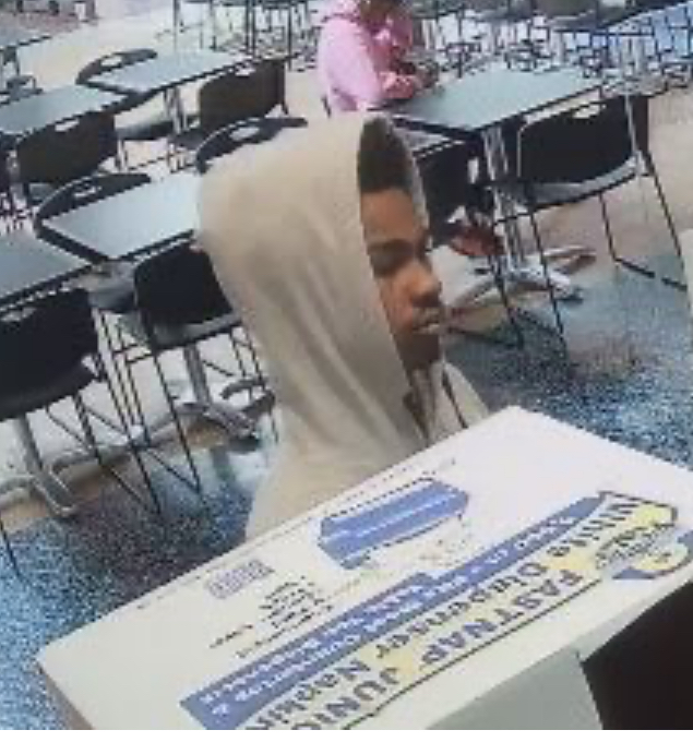The subject is described as a male black, early 20’s, 5’9’’ tall, thin build, black hair with blonde colored tips. His clothing description is a red shirt with white insignia, blue jeans and a grey hooded sweatshirt.