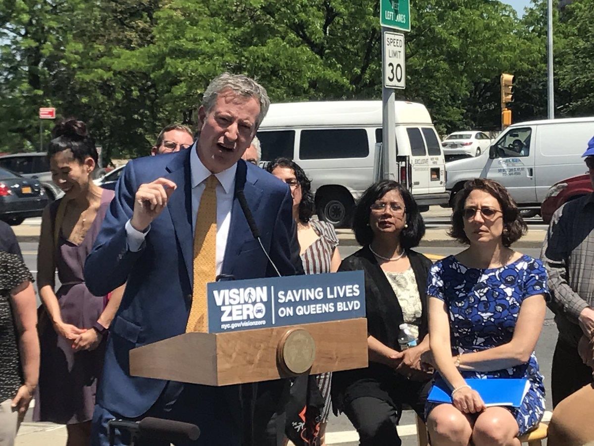 Elmhurst - Mayor di Blasio was at Queens Blvd and Woodhaven Blvd for a press conference of Phase 3 redesign. The project includes new bike lanes, expanded medians and repaved crosswalks on Queens Blvd from Elmhurst to Forest Hills. Since the project started 2 years back with Phase 1 and 2, de Blasio confirmed there was never a single traffic fatality as part of Vision Zero. Construction will start this summer. pic by Mayor's Office. Reported 3pm.