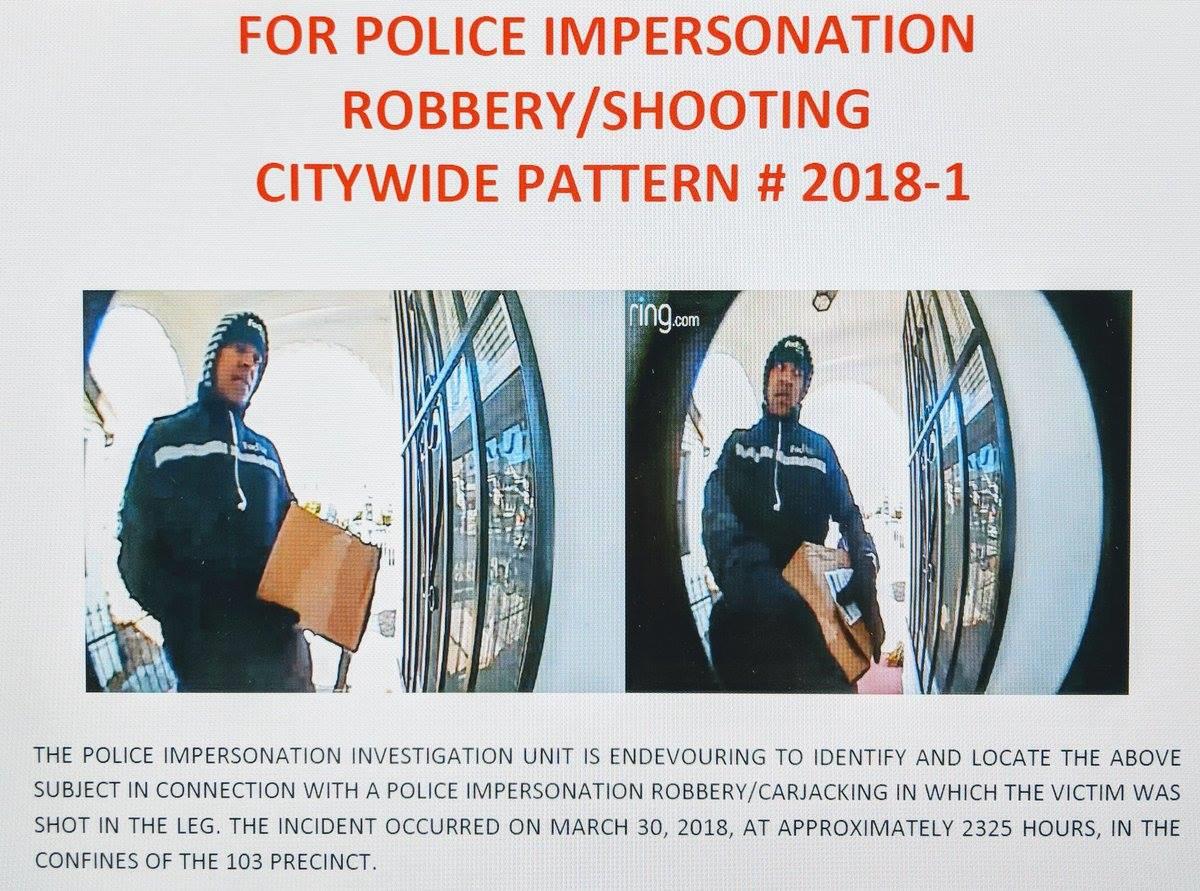 Police released the info of one suspect posing as cop and shot a driver in the leg at Hollis. The incident happened on March 30 on 202 Street near Jamaica Avenue and Francis Lewis Blvd around 11pm. One suspect is male black and the other is Hispanic. Both suspects pulled over a vehicle using a black late model Ford Crown Victoria look like police style. Then they asked the driver, where is the gun and the driver was pulled out. This is when the driver was shot in the leg after resistance and took off with the victim's vehicle. So far no arrests and the investigation is ongoing. 4/16/18 @ 5:45p