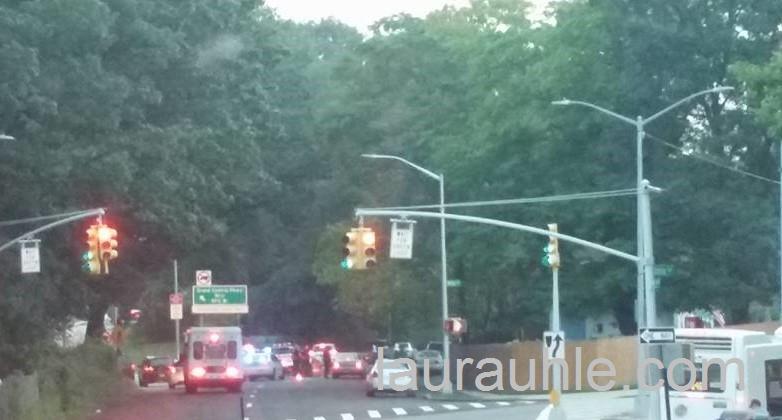 Police are checking vehicles oe by one on the service road of Grand Central Parkway entrance westbound from Union Turnpike. Both ramp entrance and service road has five police vehicles checking around.