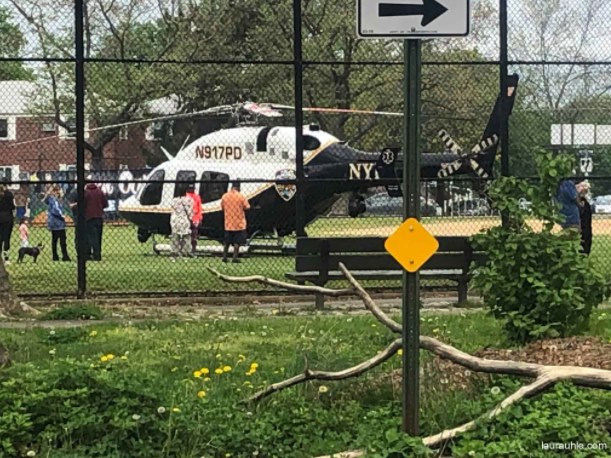 NYPD chopper landed inside the public park in Glen Oaks. This is at 260th Street and 76th Avenue. Reported the chopper landed straight down with onlookers in the area. This was a brief stop over before the funeral in Greenlawn, Suffolk County after making rounds in Bellerose by St. Gregory's.