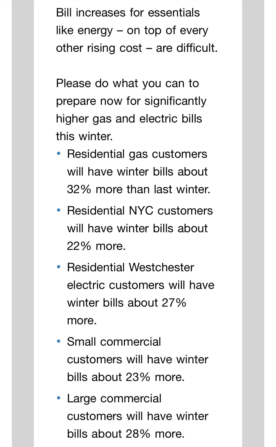 ConEd announced increase for the coming winter with prices high as over 30%.