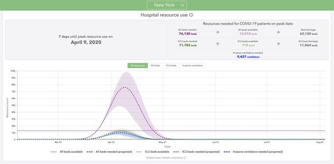 Institute for Health Metrics and Evaluation based in Seattle launched projections data of COVID-19. As of today, the forecast for NY with peak hospital use is April 9, peak deaths is April 10 and total deaths by August 4 at 16,261. Details at this link, http://covid19.healthdata.org/