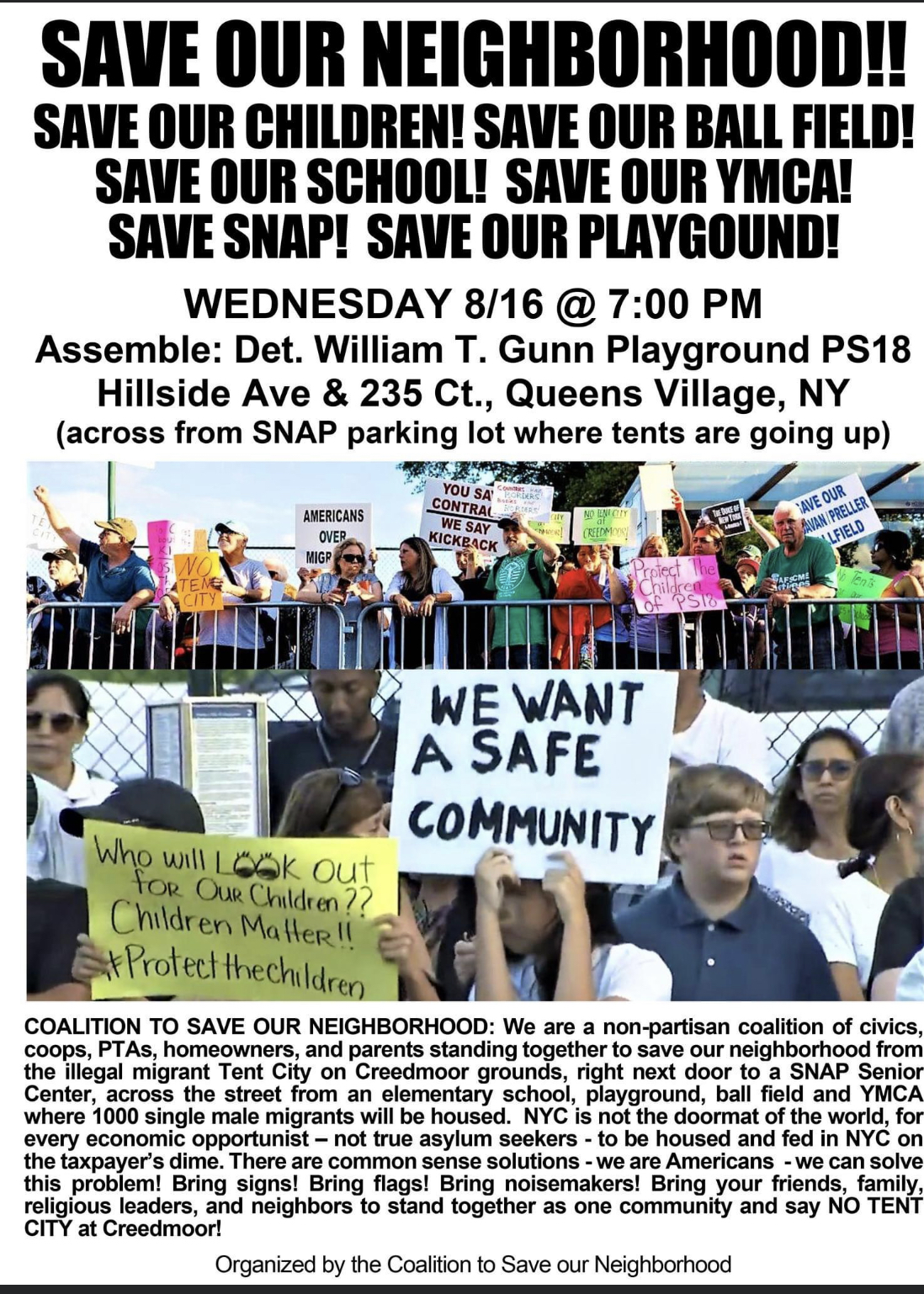 WED 8/16/23 at 7PM  -  PS 18     Hillside Ave and 235th Ct  (next to Hollis-Bellaire-Queens Village-Bellerose Little League - Preller Stadium)     PLEASE SHARE!!!!