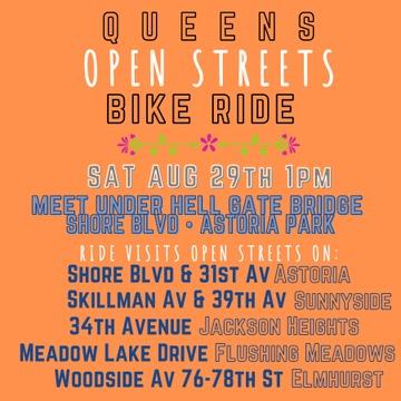 Saturday, August 29 at 1pm with meet in several locations in Queens. The meet includes 31st Avenue in Astoria, Skillman Ave and 39th Avenue in Sunnyside/Woodside, 34th Avenue in Jackson Heights and Meadow Lake Drive. The event is open to the public. Bring your own bike, helmet, mask, etc as nothing is provided.