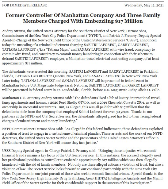 The feds in cooperation with the NYPD busted multiple people from a family for embezzling $17 million dollars. This is from the US attorney, "The defendants lived a life of luxury: international travel, fancy apartments and homes, a 2020 Ford Shelby GT500, and a 2019 Chevrolet Corvette ZR-1, as well as ownership in successful restaurants. But, as alleged, this was all paid for with $17 million that the defendants stole from the company that employed Sabitri Laforest for over 30 years. Thanks to our partners at the NYPD and U.S. Secret Service, the defendants' alleged greed has led to their facing federal charges of embezzlement and money laundering."