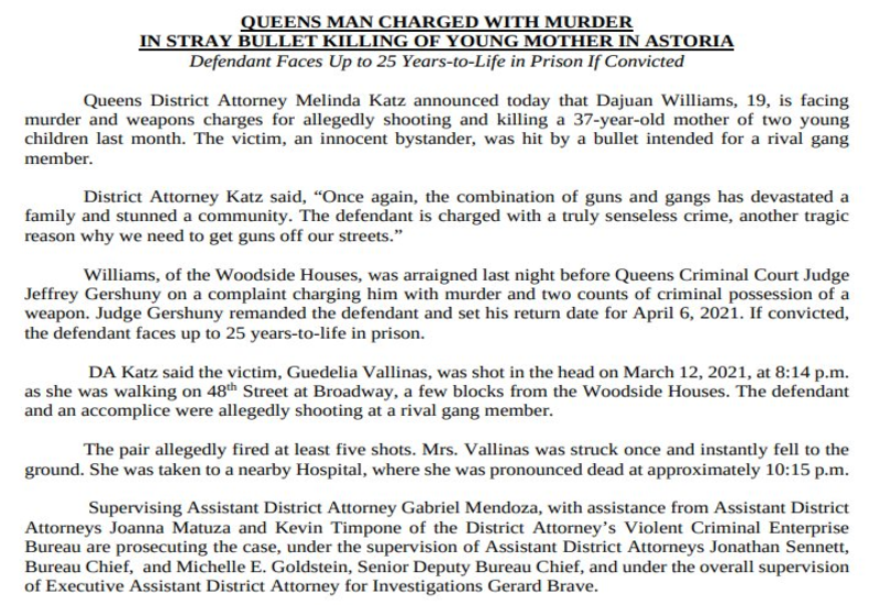 The Queens DA's office announced today that Dajuan Williams, 19, is facing murder and weapons charges for allegedly shooting and killing a 37-year-old mother of two young children last month. The victim, an innocent bystander, was hit by a bullet intended for a rival gang member.