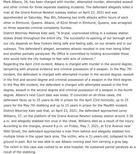 A suspect has been charged with murder, attempted murder, attempted assault and other crimes for three separate stabbing incidents. One dead at the Grand Avenue-Newton subway station on April 23, 2021 and was apprehended on Saturday, May 8th, following two knife attacks within hours of each other in Elmhurst, Queens.