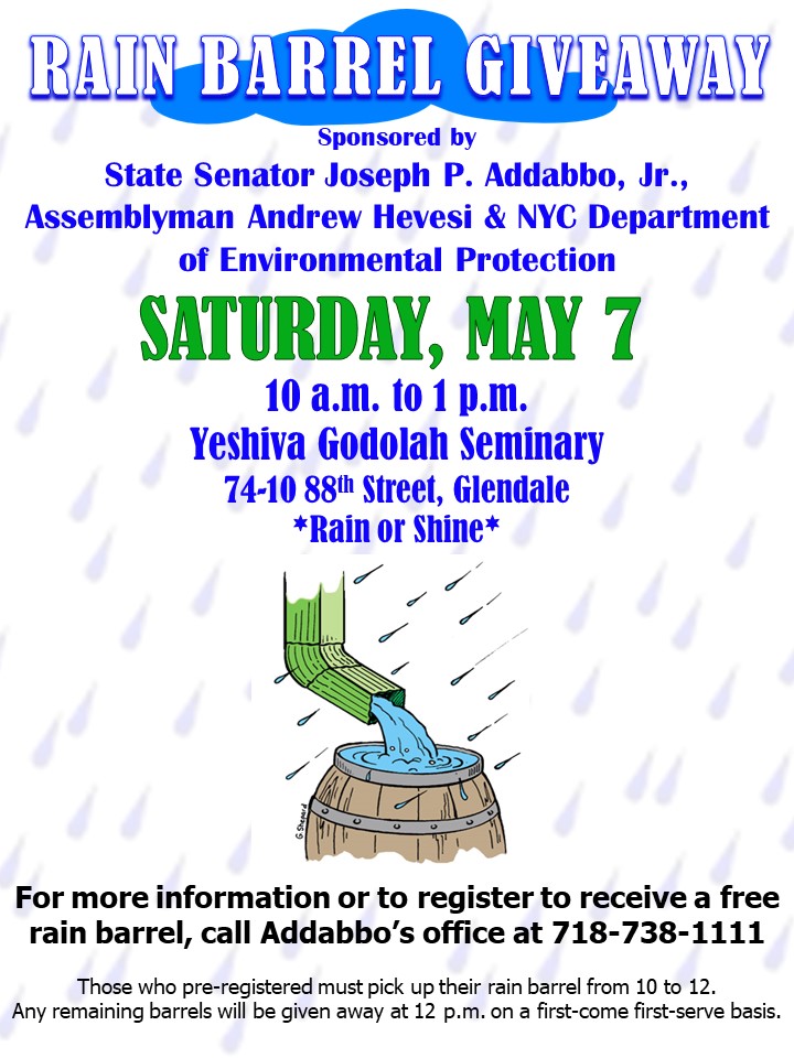 On May 7 from 10am to 1pm, Glendale residents can pick up a rain barrel from 74-10 88 Street. This is at the Yeshiva Godolah Seminary. Only 50 barrels are for registered residents. To register, call 718-738-1111. If no answer, leave your name and number at the State Senator Joseph Addabbo office.