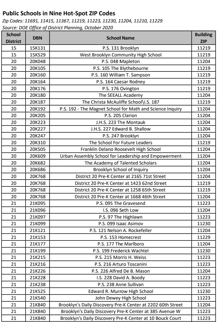 Starting tomorrow, the list of schools will go remote learning full time announced by the NYC Dept of Education. Here is the list. This is different from the mayor's list but UFT reported the governor approved list is the one to follow by all parents.
