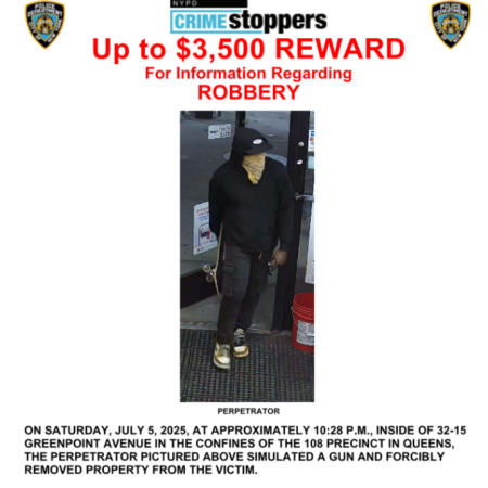 On Saturday, July 2, 2025, at approximately 10:25 pm. Inside of 32- 15 Greenpoint Avenue in the confines of the 108 precint in Queens. The perpetrator pictured above simulated a gun and forcibly removed property from the victim.