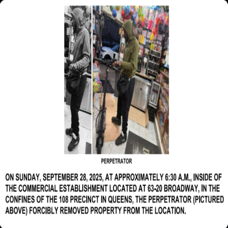On Sunday September 28 2025 at approximately 6:30 AM .Inside of the commercial establishment located at 63 -20 broadway in confines of the 108 precint in queens .The perpetrator forcibly removed property from the location.