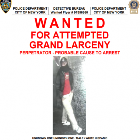 The 110 Precinct Detective Squad is endeavoring to identify and locate the pictured subject wanted for a grand larceny that occurred on 11/11/24 at approximately 3:45AM in front 75-08 Roosevelt Avenue.