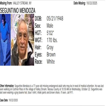 Seguntino Mendoza, M/W/77 from Nassau County. The missing has medical conditions and may be in need of medical attention.