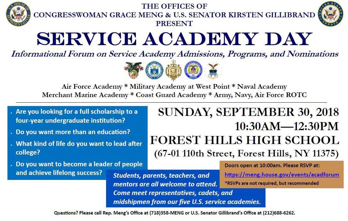 Sunday, September 30 from 10:30am to 12:30pm at Forest Hills High School. For students interested in attending one of the US Service Academies. Open to the public.