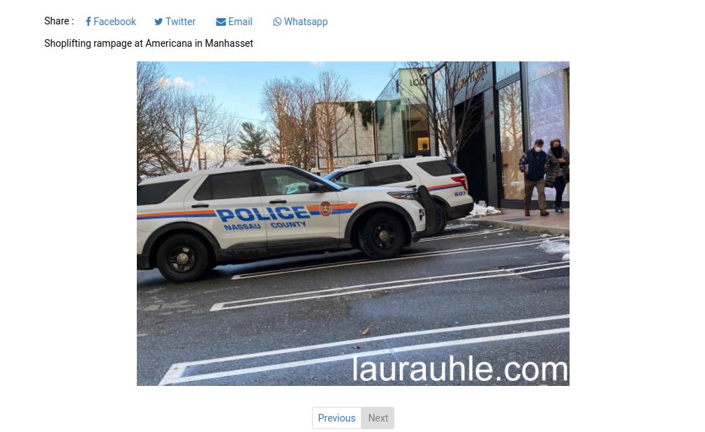 Police are called to the Americana on Northern Blvd near Port Washington Blvd reporting a large group of black males and females stormed into one of the stores and took off with items. Reported they took off with high end items toward eastbound in a 2021 black jeep, Grand Cherokee. Chopper is notified after the license plates have been identified to Brentwood, Suffolk County address. Ongoing investigation.