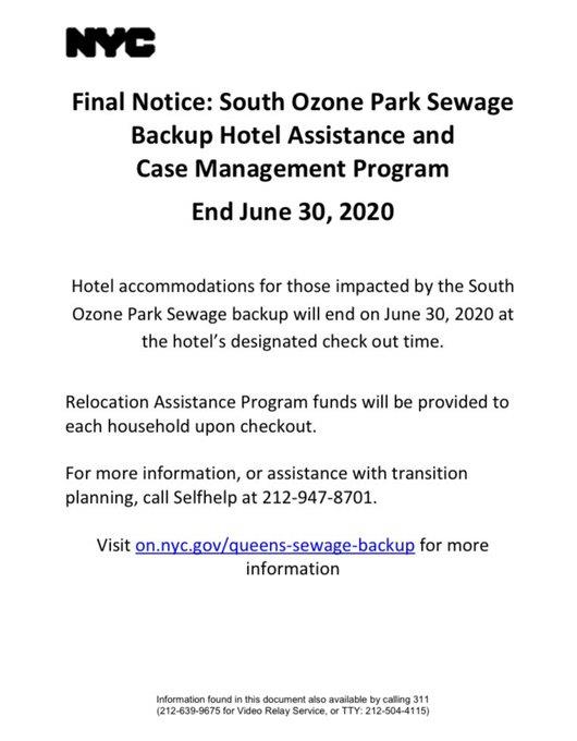 The city issued notices to all families living in hotels after sewage damaged their homes. By June 30th, they will have to find another location on their own instead of continuing to remain in hotels. The incident was reported back in December 2019 when the city admitted a pipe broke causing flood damages in over 100 homes in South Ozone Park. After protesting at their local politician's offices, claims were filed out for 54 residents. One drawback was the city told residents they don't have sewage insurance over flood insurance which caused temporary stay for two weeks in hotels until a deal was arranged. Another 10 families were extended but now they have to relocate due to budget cuts.