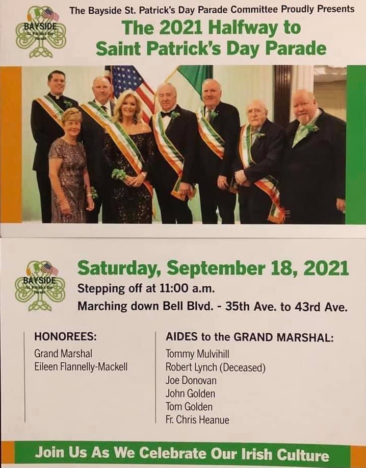 Saturday, September 18 at 11am on Bell Blvd from 35th to 43rd Avenues in Bayside. This is 2021 Halfway to St Patrick's Day Parade. Drivers are advised to use alternate traffic. The event is open to the public.