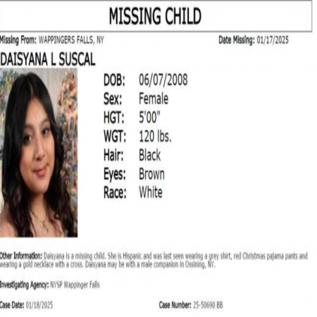 State Police in Troop F (SP Wappinger) is searching for DAISYANA L. SUSCAL, age 16, left her residence in Wappingers Falls in the early hours on January 18, 2025.
