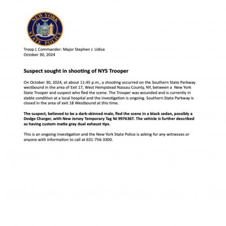 State Police are seeking a black sedan, possibly a Dodge Charger, with NJ temp tag 997636T, involved in the shooting of a Trooper on the Southern State Pkwy in Hempstead on 10/30/24 at 11:45 p.m. The Trooper is in stable condition. Please call 631-756-3300  if you have info.