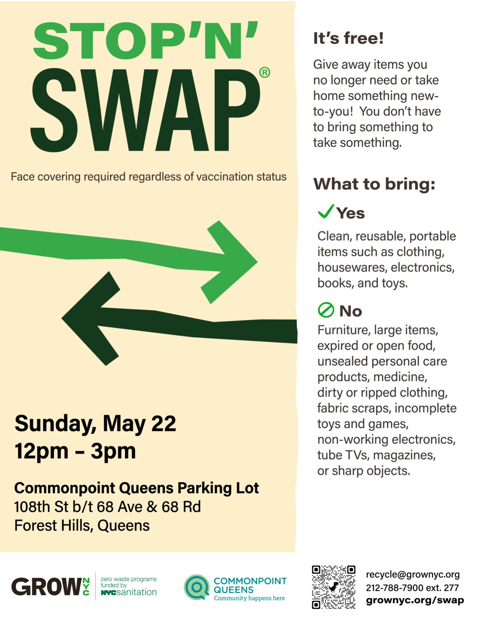 Sunday, May 22 from 12pm to 3pm at Commonpoint Queens Parking lot, 108 Street between 68th Avenue and 68th Road. This is in Forest Hills.