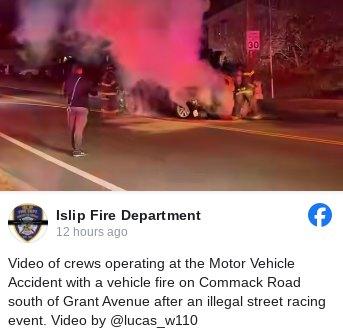 In Islip last night around 2am, police were called to Commack Road near the Sunrise Highway overpass reporting illegal car racing. All drivers took off resulting in one vehicle on fire, multiple crashes toward parked vehicles. So far no arrests.