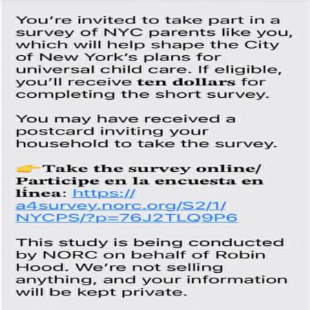 Households that receive a postcard ​can visit nycparents.norc.org and enter their PIN to access the survey ​and receive a digital payment for completing it. ​​Other families can visit ​nyc.gov/parentsurvey​ for a chance to participate. All other links are scams and avoid at all costs which may collect your personal info from your phone.