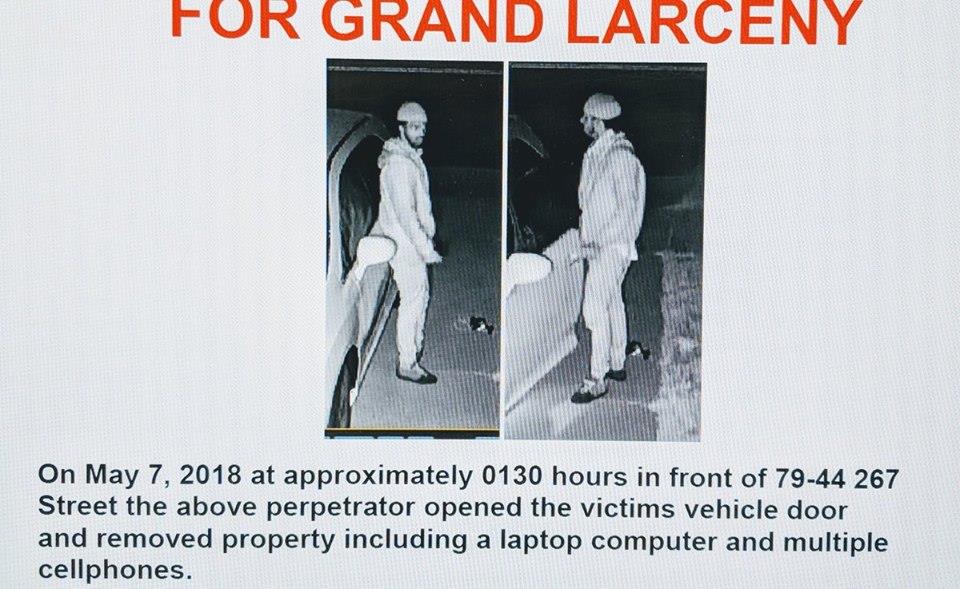 Police released details and pic of suspect wanted for stealing phones and laptop from a vehicle in Floral Park. It happened on May 7 around 1:30pm on 267 Street near 79th Avenue. Ongoing investigation.