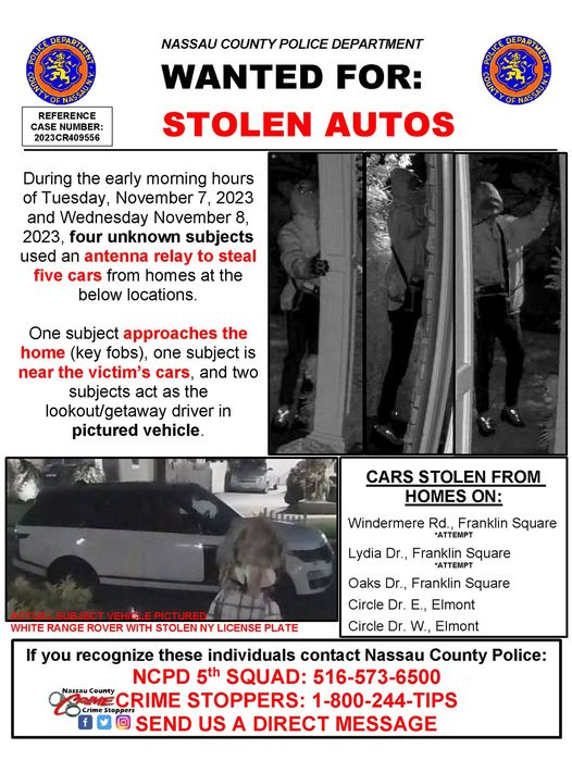 The NCPD released details of four suspects wanted for auto thefts in the vicinity of Franklin Square and Elmont.