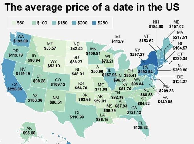 NY leads with two people on a date costs almost $300 followed by New Jersey and California. South Dakota is the lowest cost followed by North Dakota, Nebraska and Wyoming. The data was compiled by Match.com.