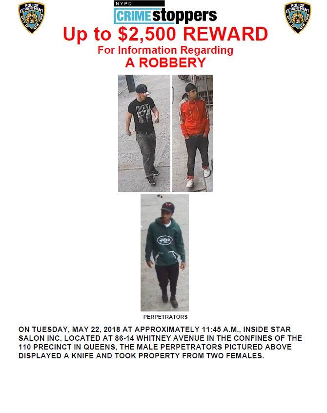NYPD released pic of suspects wanted for armed robbery at Star Salon in Corona. It happened on May 22 around 11:45am at 86-14 Whitney Avenue. Three male suspects entered inside the salon and threatened 2 female workers with a knife. Then took off with their personal items. Ongoing investigation.