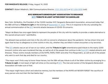 The Tunnel to Towers Foundation will be working to make sure the Tower of Light, an iconic symbol of hope of September 11 that will be light up the spot of former location of World Trade Center. The Sergeant Benevolent Association also reported the lights will be on regardless of NYC mayor's decision.