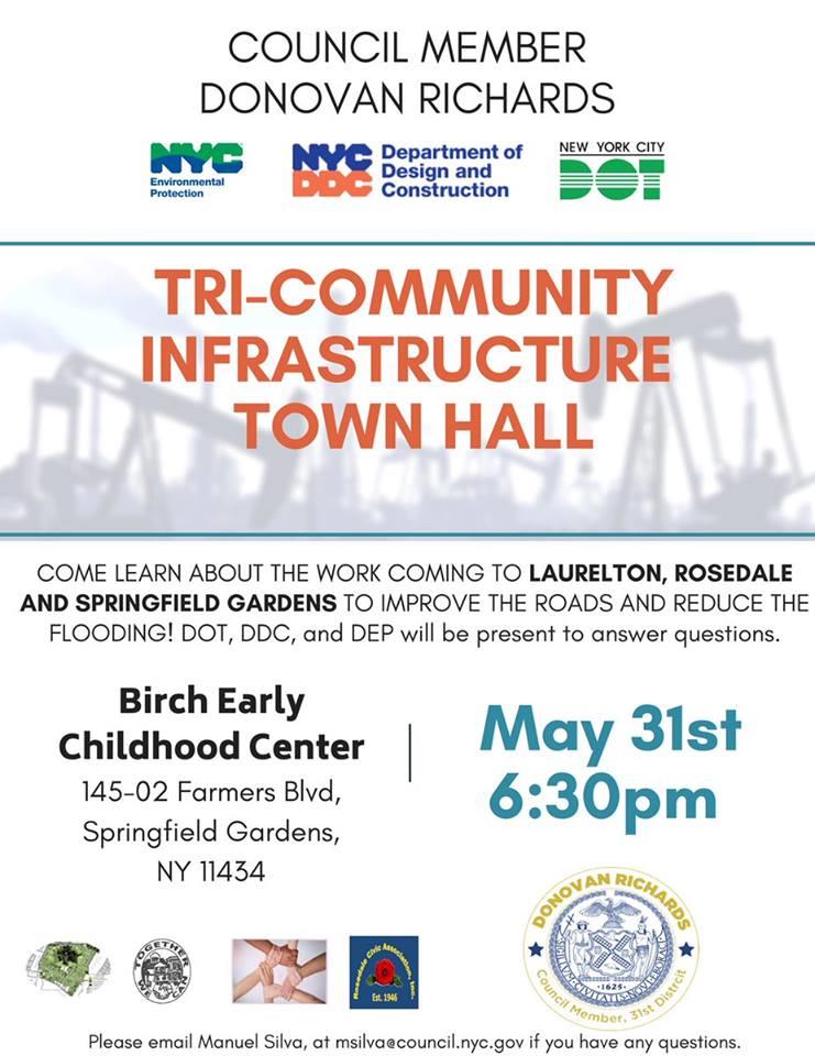 Laurelton, Rosedale and Springfield Garden residents can attend the event to know more about upcoming infrastructure services. Thursday, May 31 at 6:30pm in 145-02 Farmers Blvd, Springfield Gardens. Open to the public.