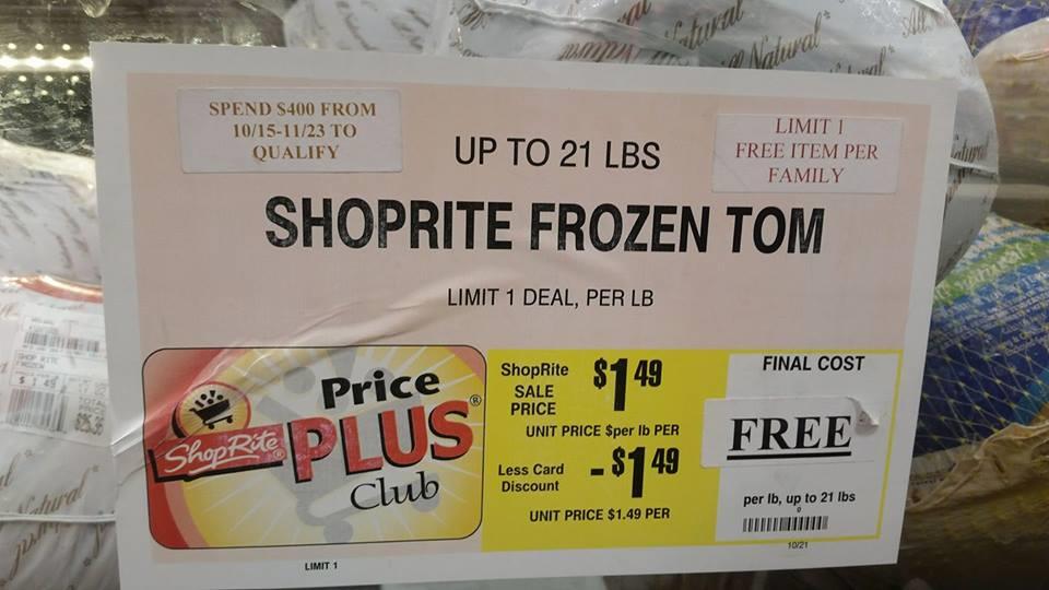 When shoppers went to ShopRite at New Hyde Park to buy turkey for Thanksgiving, they were in a bigger surprise. Some were free while others were just fifty cents or less. The only catch is one must spend $400 between October 15 to November 23 to qualify. Also, its limited to one person per family. The $400 purchase is automatically added to the member's ShopRite card which will alert the cashier. If $400 is not met, then the regular price applies which range from $40 to $50 per turkey. The management reported the promotion is confusing but giving it a try and didn't respond when asked the same campaign will be set for next year.