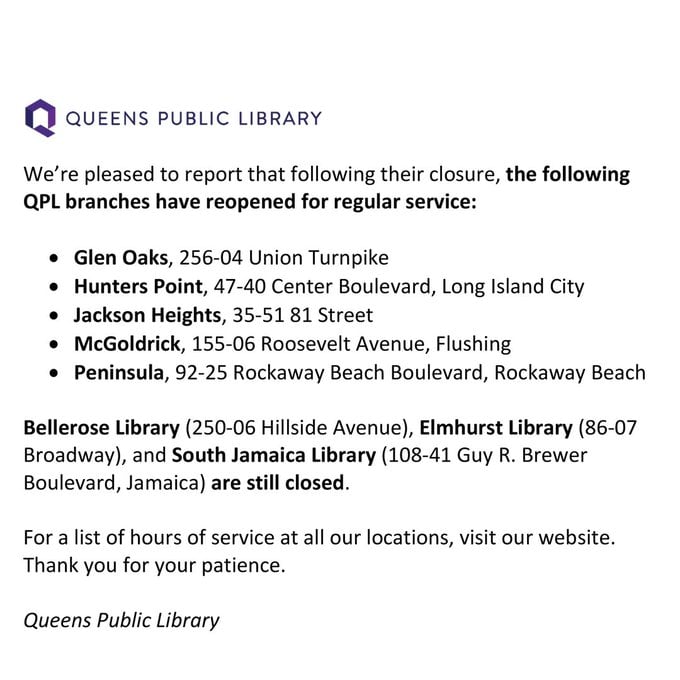 Three more libraries have added to the list of closure. Bellerose, Elmhurst and South Jamaica will remain closed due to staff tested positive. The other libraries which were closed are now open to the public. Come and learn with so much to choose from.