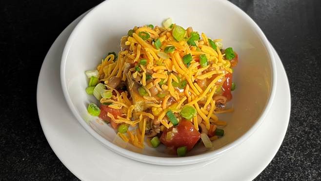 One of the dish is southern black-eye pea casserole with plant based corn bread topped with plant based shredded cheese seen in the picture.