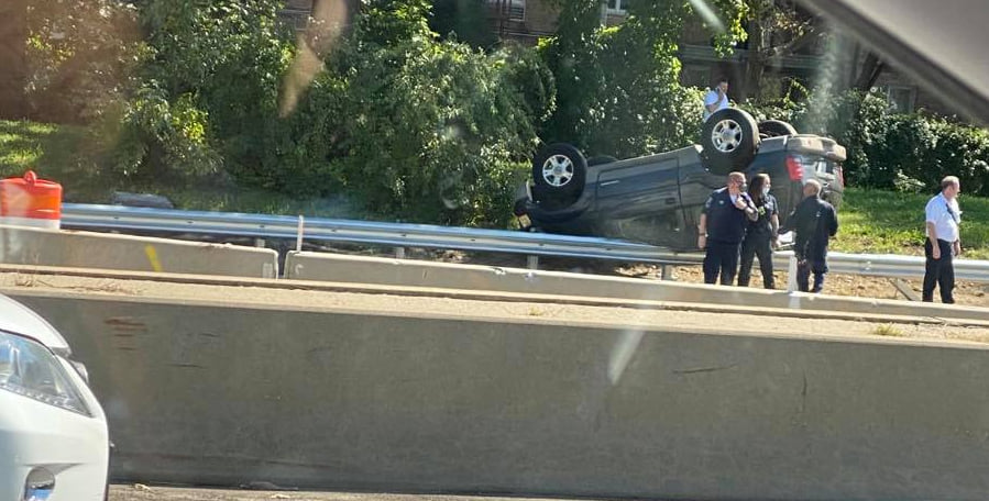 Heavy delays on the Grand Central Parkway eastbound after Cross Island Parkway reporting a vehicle flipped and went into the wood. ESU is working on the scene. EMS is checking for injuries. Heavy delays in both directions.