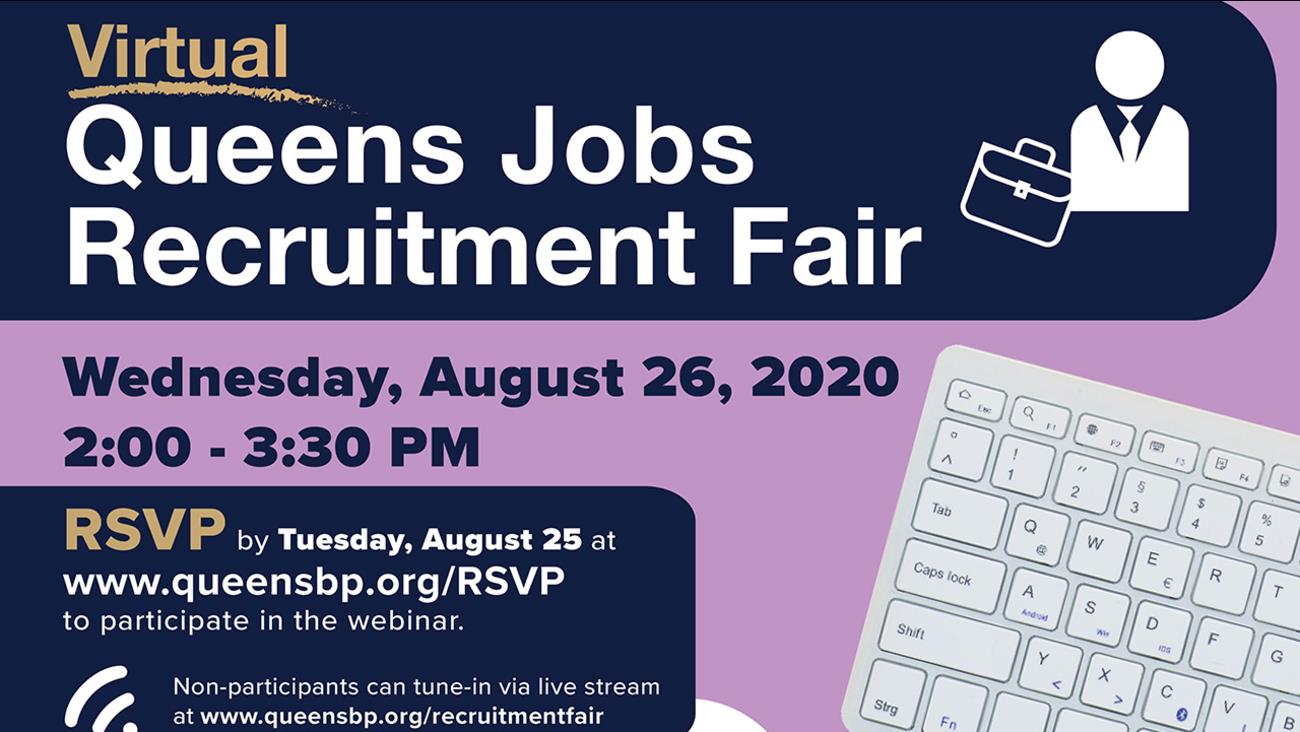 Wednesday, August 26, virtual jobs recruitment will take place. Registration is mandatory and must RSVP by August 25. The event will take place from 2 to 3:30pm using your computer. Open to the public. Here is the link to register, www.queensbp.org/rsvp.