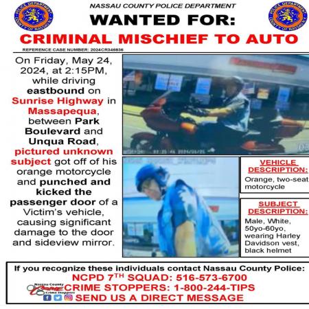 Wanted for criminal mischief to auto in Massapequa