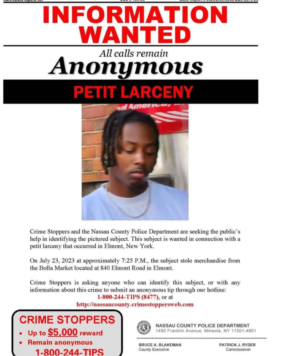 NASSAU COUNTY CRIMESTOPPERS 1-800-244-TIPS (8477)