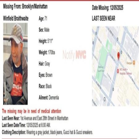 Winfield Braithwaite, Male/Black/71 from the area of Avenue L and East 86th Street in Brooklyn.