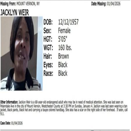 Jacklyn Weir, F/B/68 from Mount Vernon, NY.  Jacklyn was last seen in the area of Pelamdale Avenue. The missing may be in need of medical attention.
