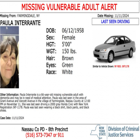 Paula Interrante, Female/White/66 years old from Farmingdale, NY. The missing has dementia and may be in need of medical attention.