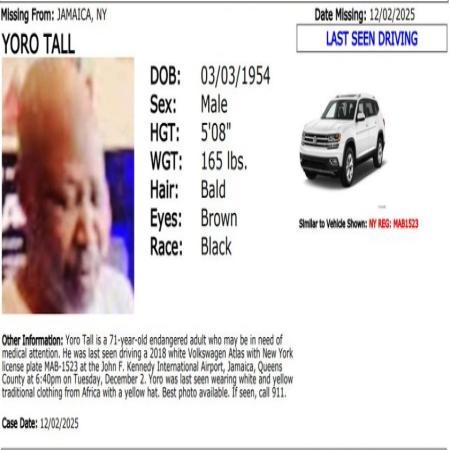 Yoro Tall, M/B/71 from Jamaica, NY.  Yoro was last seen at John F Kennedy Airport. The missing has dementia and may be in need of medical attention.