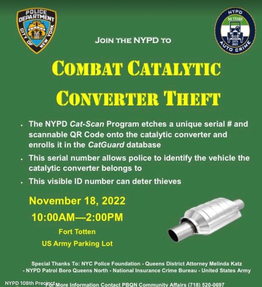 On November 18 from 10am to 2pm, the NYPD cat scan program will etch a number to the catalytic converter. If stolen and found, you can get it back.